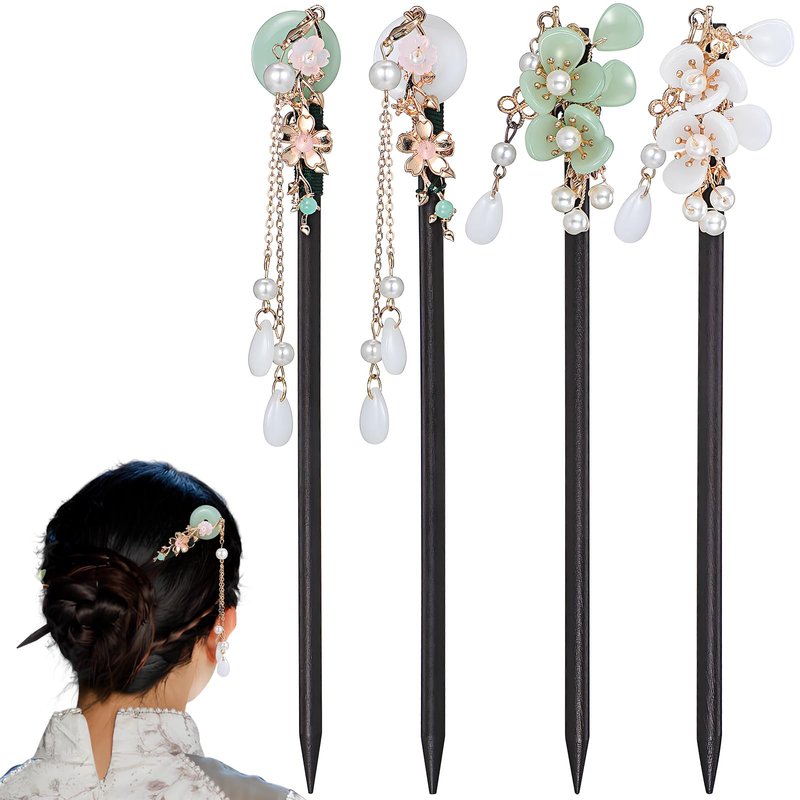 Healeved 4 PCS Chinese Hair Sticks Hair Chopsticks for Women Vintage Tassel Hair Pin Chinese Hairpins Wooden Hair Sticks for Thick Hair Chinese Traditional Flower Hair Sticks