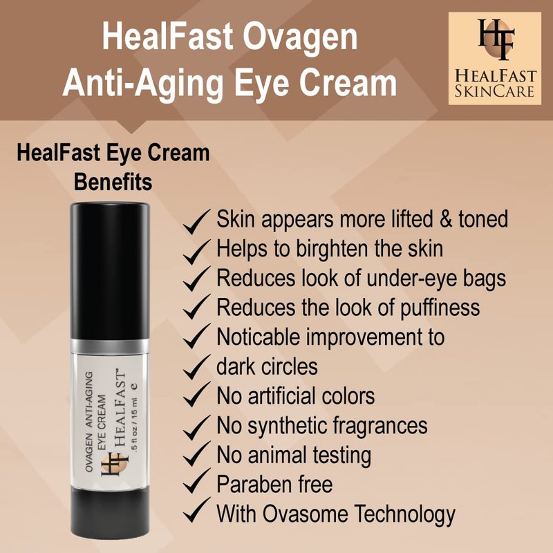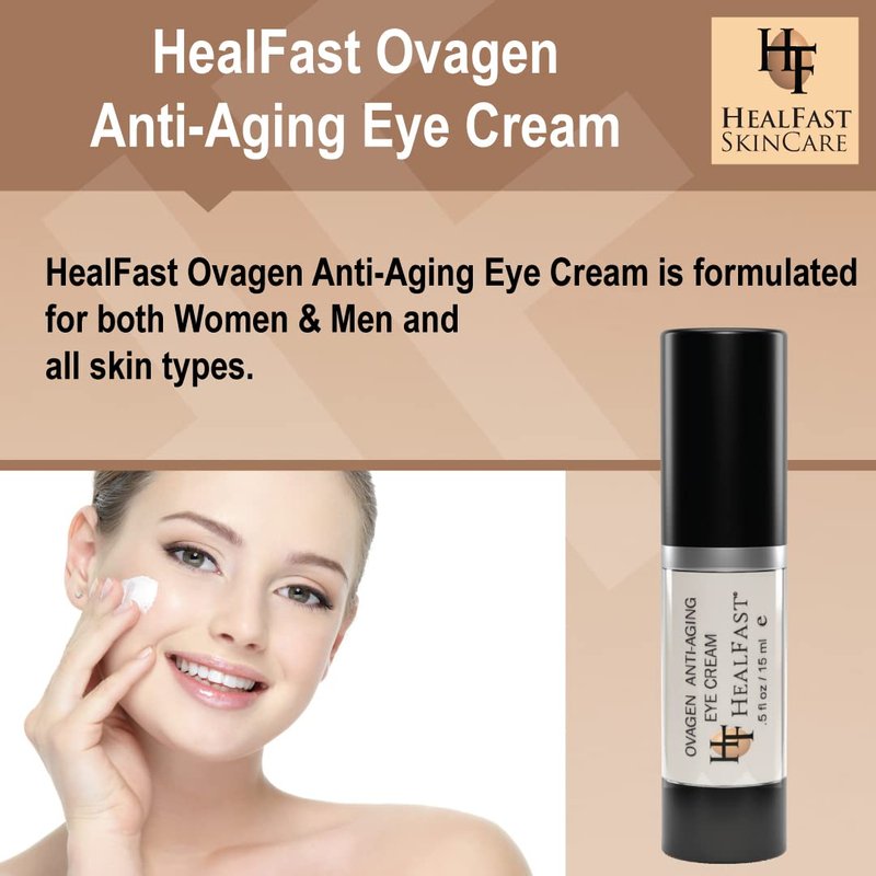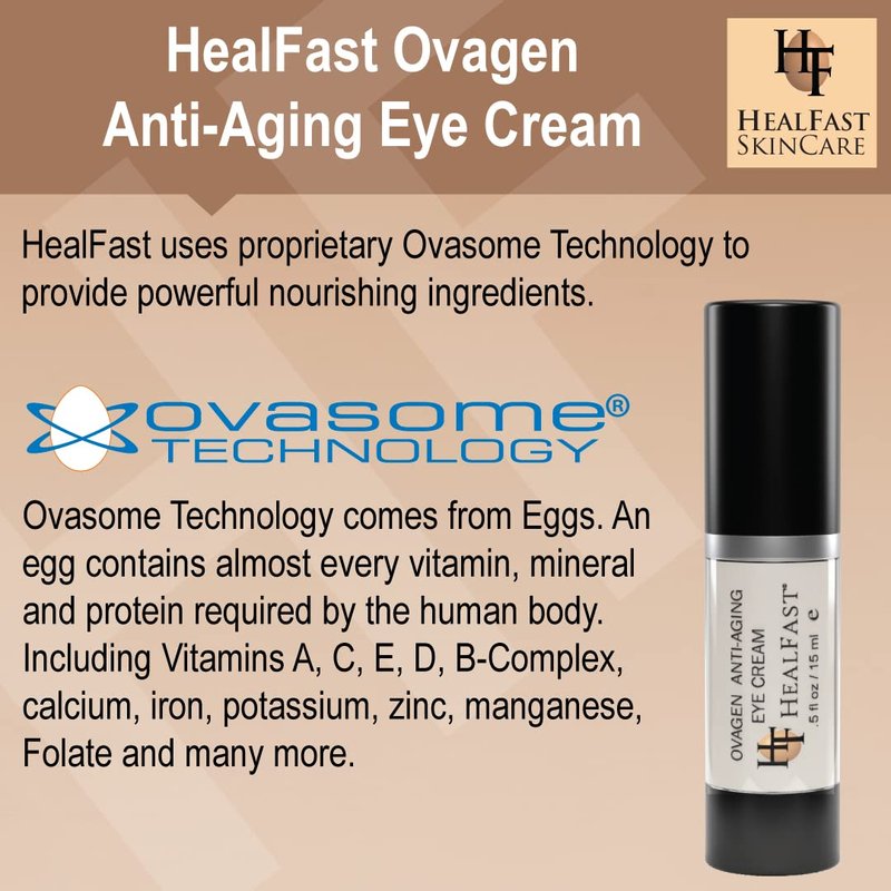 HealFast SkinCare Ovagen Anti-Aging Eye Cream is a scientifically formulated cream developed specifically to correct and prevent puffiness, dark circles, fine lines and wrinkles around the delicate eye area. The cream features a pure rosemary extract, together with our proprietary Ovasome Technology. Rosmarinus officinalis contains over two dozen antioxidant vitamins and is known to improve the appearance of dark circles under the eyes. Skin appears brighter, more firm, lifted and toned, after just one use. Our proprietary Ovasome Technology contains all of the natural building blocks of life. We draw upon this technology to provide over 70 vitamins, minerals and proteins that are essential to healthy looking skin. PRODUCT PERFORMANCE & FEATURES Reduces the look of puffiness & dark circles. Eyes look refreshed and awake. Helps to brighten the skin. Improves the look of fine lines and wrinkles. Skin appears more lifted and toned. Reduces the look of under-eye bags. No artifical colors. No synthetic fragrances. No animal testing. Paraben free. ABOUT HEALFAST SKINCARE HealFast SkinCare is a brand of high-performance products that naturally nourish the skin and prevent signs of aging. HealFast Skincare formulates and markets topical skin preparations to high-end pharmacies, spas, plastic surgeons and dermatologists. All products created are based on Ovasome Technology, a proprietary process that incorporates eggs into topical skin care preparations.