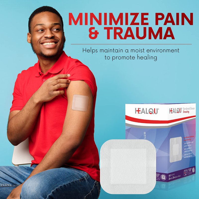 HEALQU Bordered Gauze Island Dressing - 50 Count, 2" x 2" Sterile Individually Wrapped Gauze Pads with Water-Resistant, Non-Woven Backing - Soft and Breathable Wound Dressing for First Aid and Medical