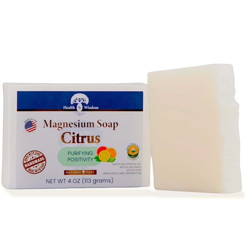 Health and Wisdom Magnesium Soap Bar with Orange, Lemon and Grapefruit Essential Oils That are Purifying and Promote Positivity, Made of Magnesium Oil and Aloe for Moisturized Skin (Citrus Scent, 4oz) BENEFITS: Soothing bar soap with pure magnesium chloride cleans, purifies and leaves skin soft and radiant. While promoting the relaxation of muscle tension. USES: Our natural Magnesium Soap is perfect to replace your body soap that is full of chemicals you can't even pronounce while taking in the wonderful benefits of magnesium. Our soap line is also a wonderful hand soap, washing away dirt and grime. INGREDIENTS: Magnesium Oil, Pure Aloe Vera, Coconut Oil and Shea Butter a great lotion and moisturizer helping soothe and hydrate the skin. ABSORPTION: Magnesium is absorbed through the skin and directly into the tissue and cells. Research suggests that transdermal magnesium application has more absorbency rate than magnesium supplements or magnesium from food sources. APPLICATION: Apply directly to skin with water while bathing or washing hands. Magnesium will absorb through the skin.