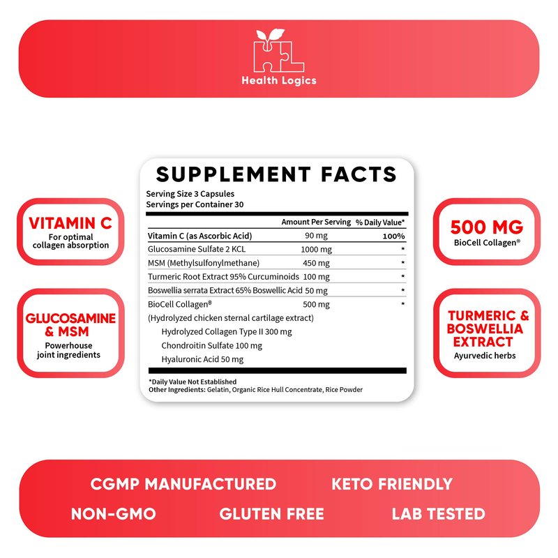 Health Logics Move! Healthy Joints with BioCell Collagen, Glucosamine, MSM, Vitamin C, Turmeric Extract 95% Curcuminoids, Boswellia Serrata | Support Joint Comfort | Non-GMO | 90 Capsules