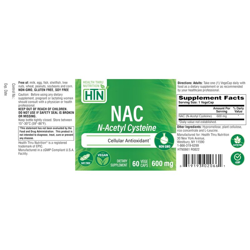 - šŖ THE PUREST MOST POWERFUL NAC SUPPLEMENT : Health Thru Nutrition's VEGAN (Certified by The Vegan Society) N Acetyl Cysteine contains 600mg of NAC per capsule. Each easy to swallow gluten free & soy free vegetable capsule supports the production of glutathione & can help maintain your overall health