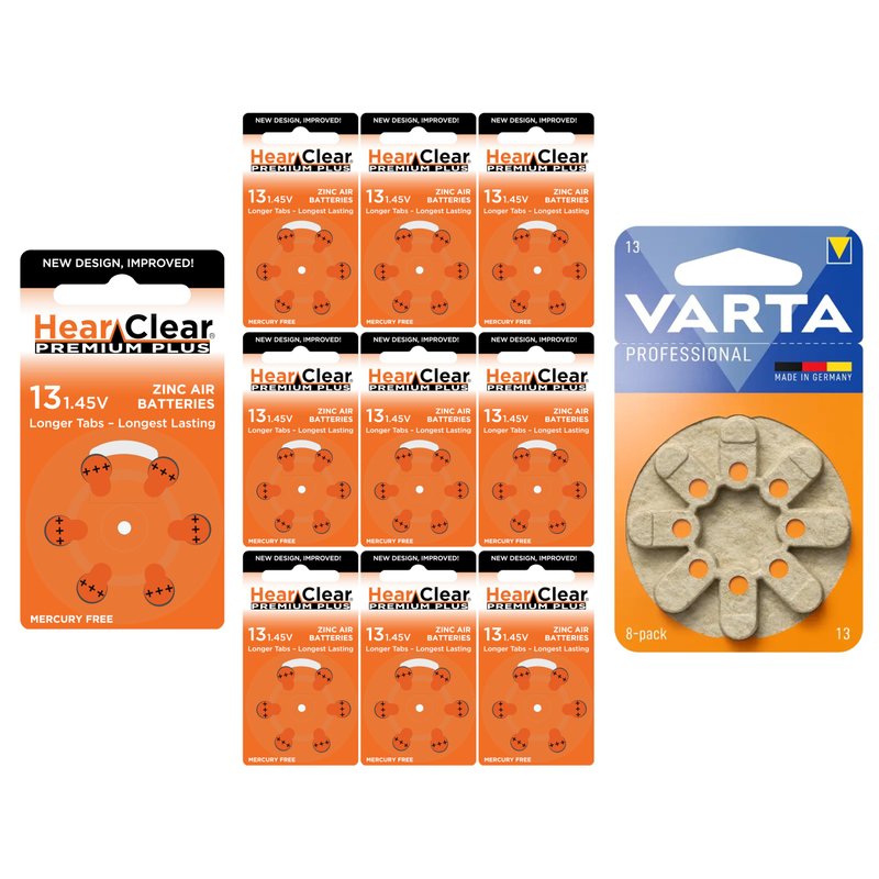 Hear Clear Size 13 PR48 Hearing Aid Batteries 1.45V Orange Tab (60 Batteries) + Bonus Varta 8 Pack