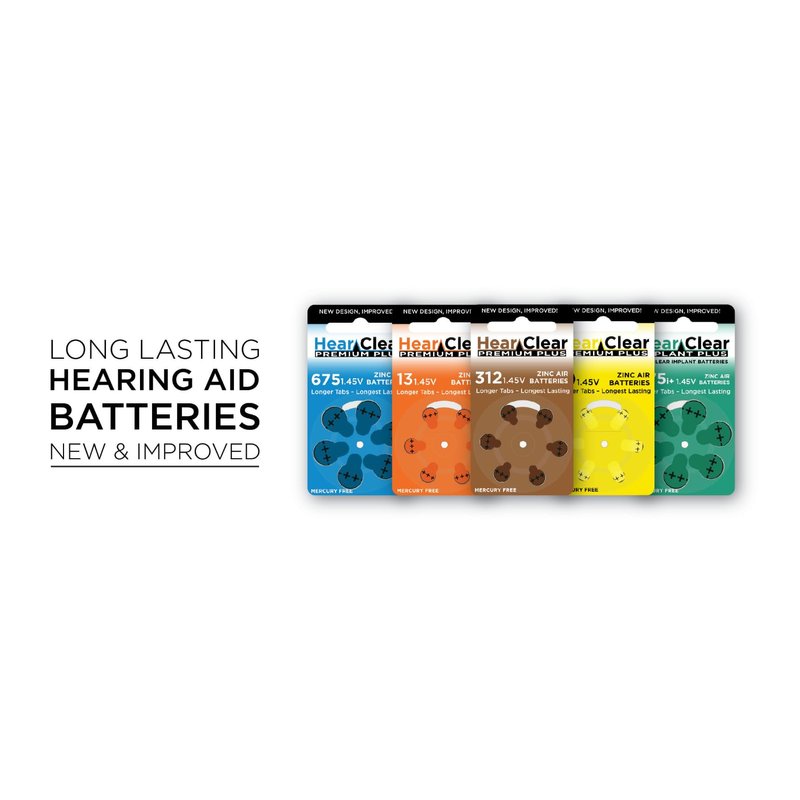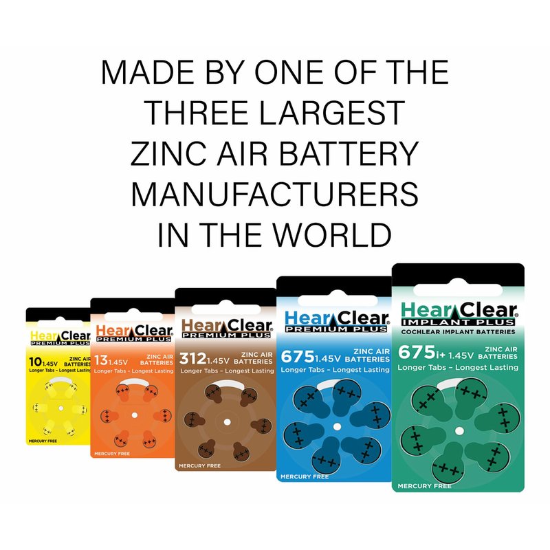 HearClear hearing aid batteries are backed with over 23 years of research and development, utilizing a unique patented technology in their design. HearClear batteries are 1.45V, suitable for hearing aids using zinc air batteries and are available in sizes 10, 13, 312, 675, and the 675P cochlear battery for cochlear implant devices. These batteries are made in the USA with US and global parts.