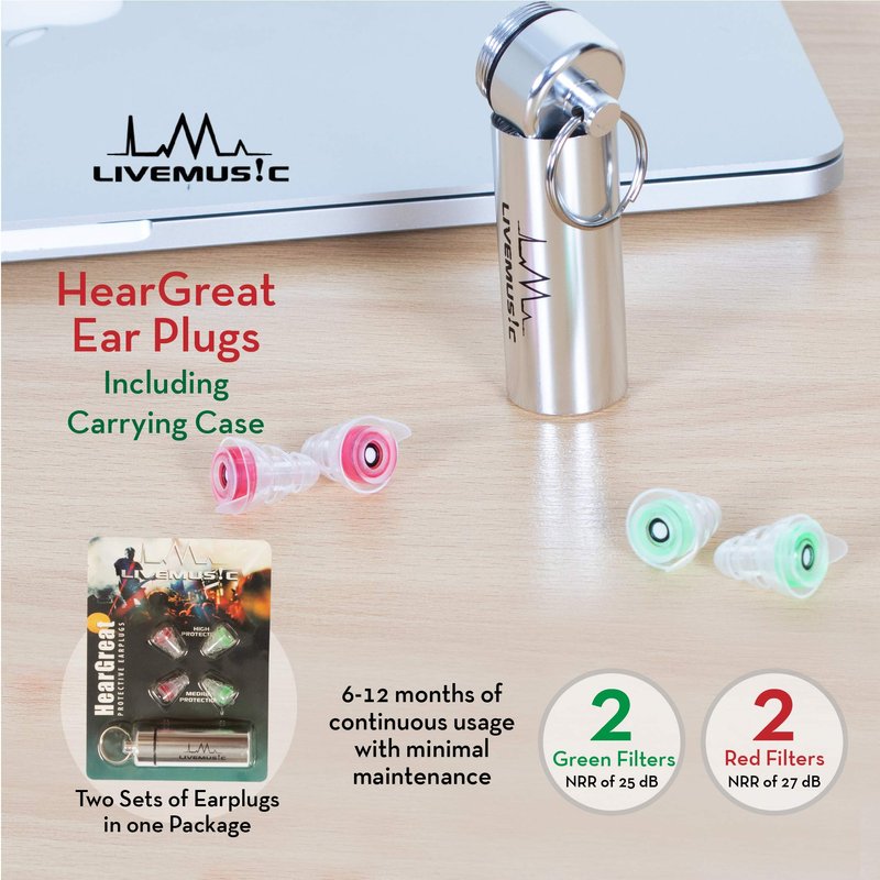 - QUIET DOWN – Loud noises hurt hearing over time. Reduce damaging decibels while allowing clearer, quieter sound through HearGreat, high-fidelity reusable ear plugs by LiveMusic.
