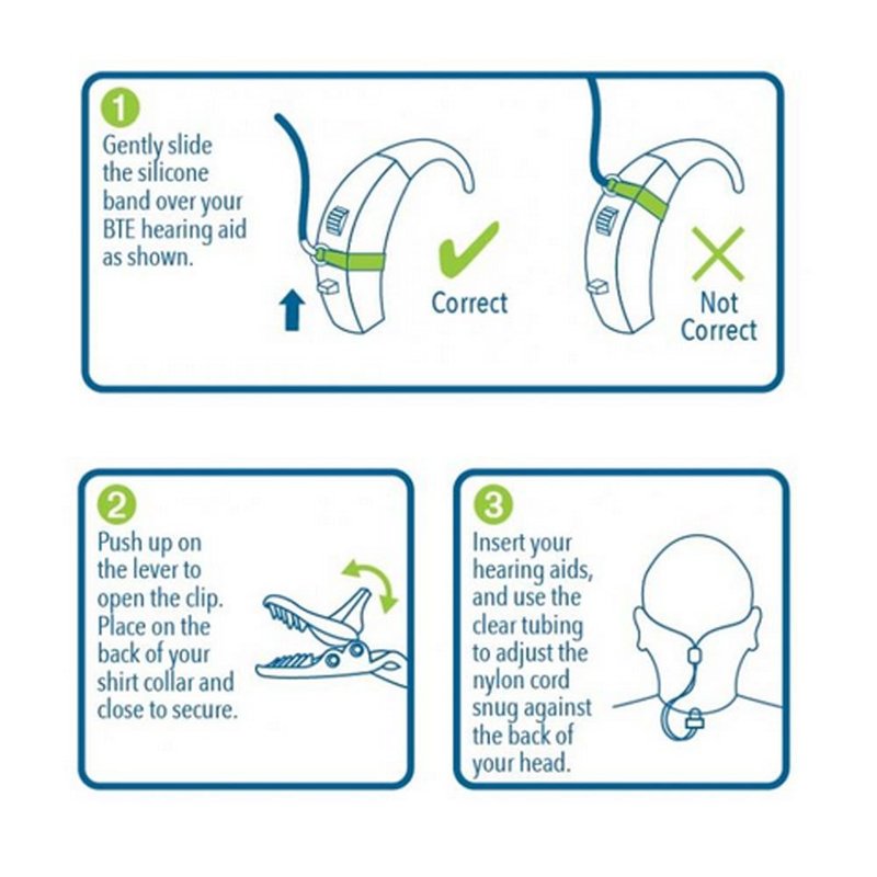 Used to protect BTE against falling off. A silicone ring slides easily and securely over the BTE (behind-the-ear) hearing aid OR uses the jewelry clip to attach to a grommet on an ITE (in-the-ear) hearing aid.