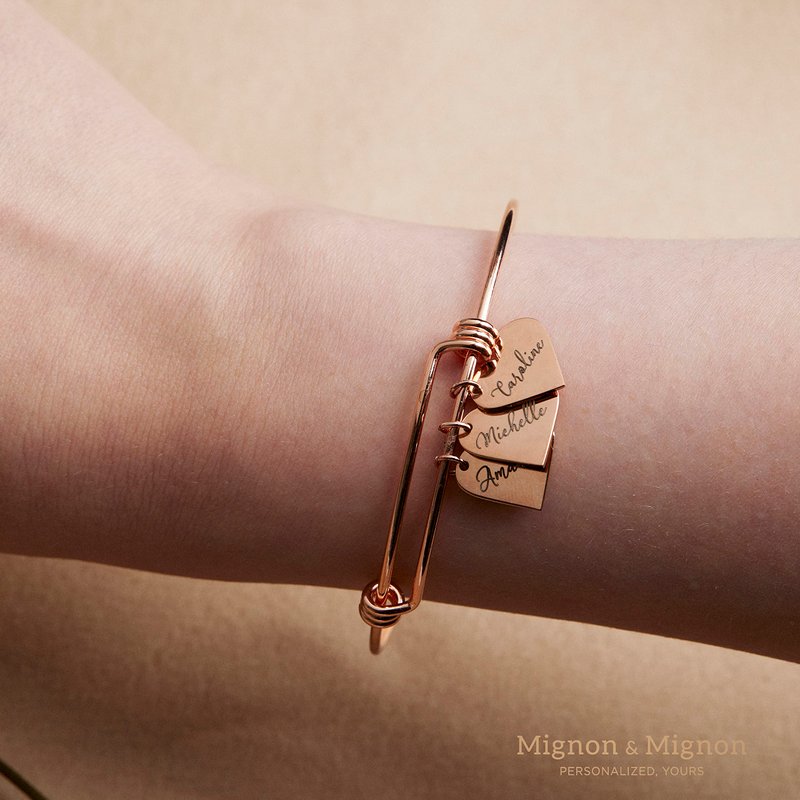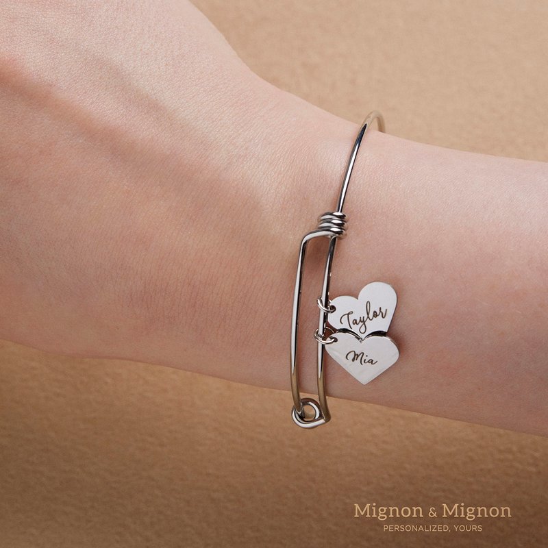 This adjustable heart charm bracelet features one or multiple customizable heart charms.