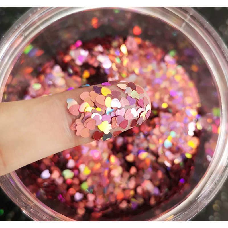 - Heart shaped glitter confetti, holographic sequins, have high luster and color retention, their surface is smooth, reflecting multiple colors