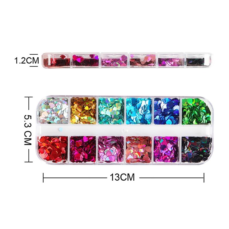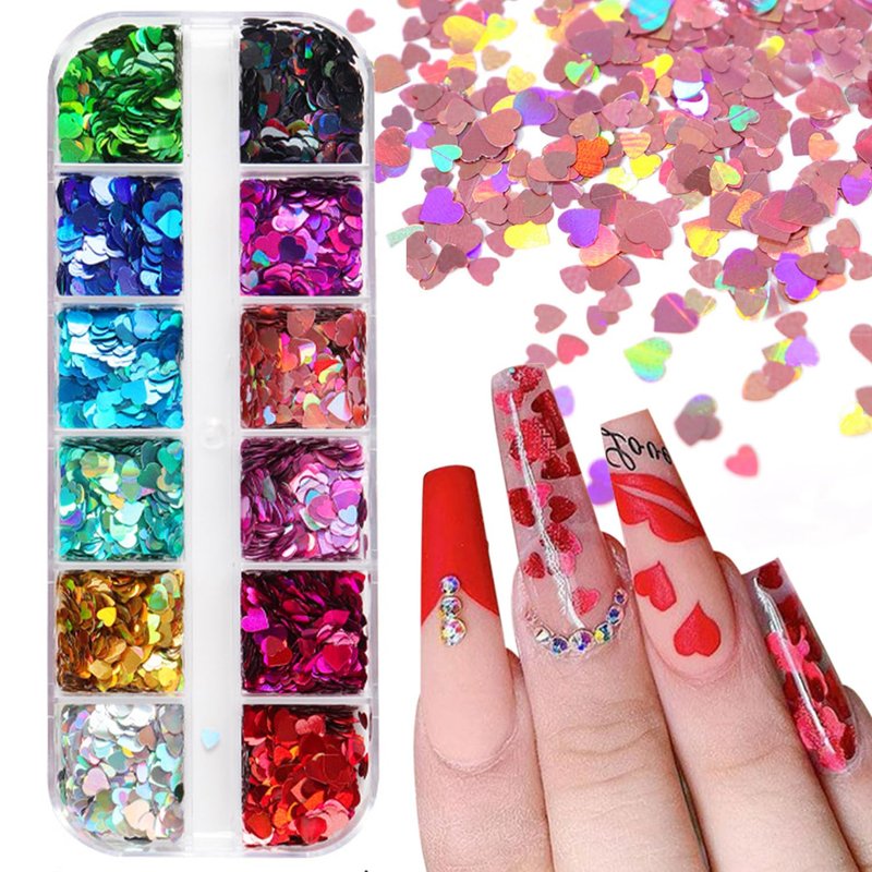 - Package:You will receive 12 grids heart nail art sequins set can make you easily complete the DIY nail art and make the nails look dazzling.Making you special shinning and you definitely can be a party queen!