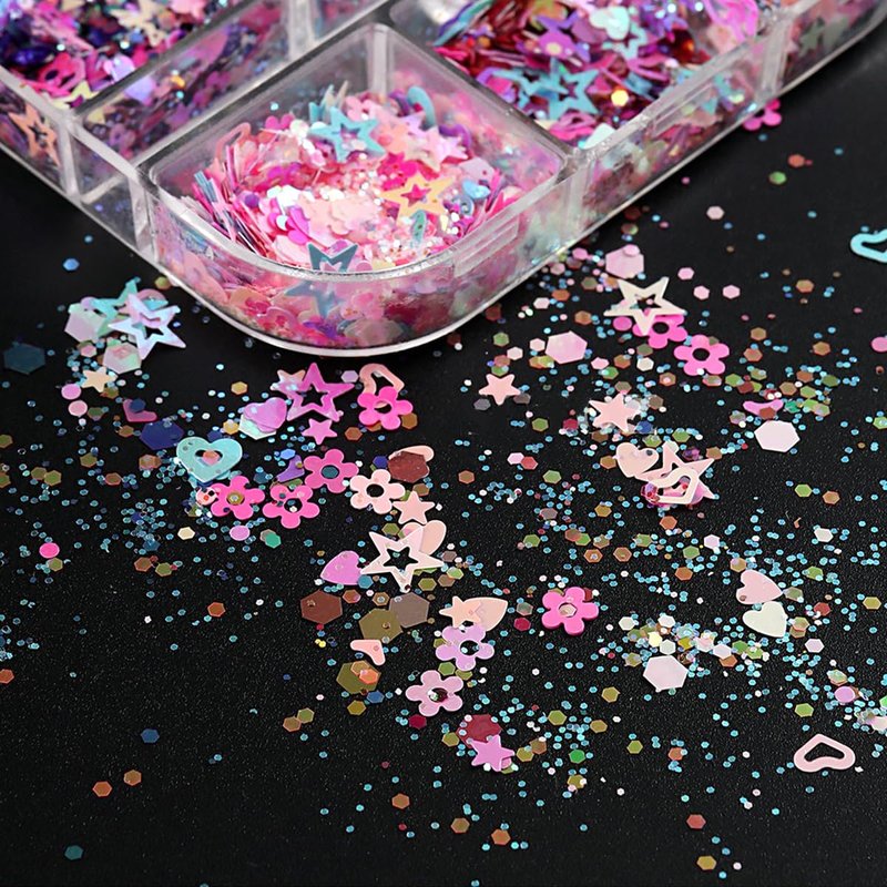 - Package Include: 6 grids star nail glitters come with 6 designs with separate storage space, shinning star heart flower nail designs. An instructions card is included in the package.