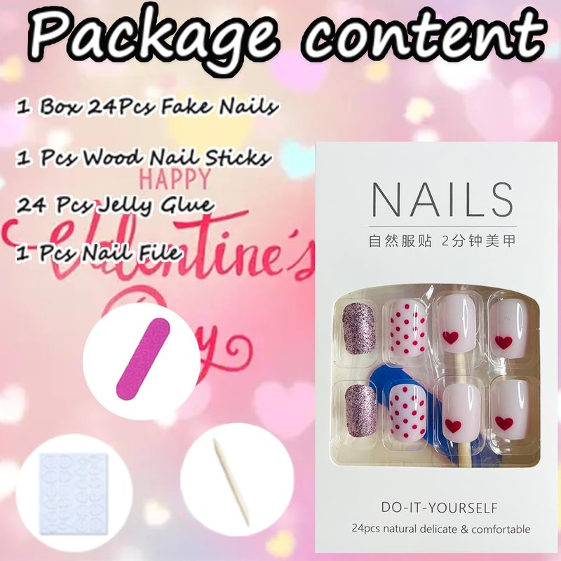- đăValentines Press on Nails SetăYou will get a box of 24 pcs cute heart fake nails + 1 nail file + 24 pcs Jelly glue stickers+1 wooden stick.(durability of jelly glue is not as good as liquid glue, but it makes fake nails reusable. Please use suitable glue according to different scenes)