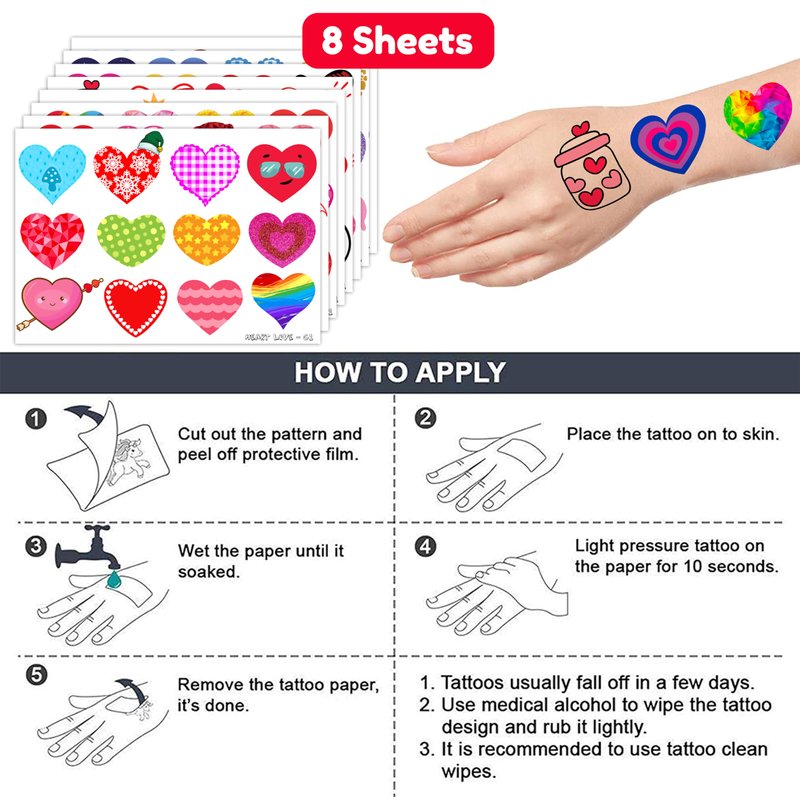 - 💓 [PERFECT TATTOOS FOR THEMED HEART LOVE ]: Heart Love Temporary Tattoos stickers come in a set of 8 sheets in total. These 8 sheets boast a total of 85 exquisite and charming designs, making our collection a must-have for enthusiasts of all ages who hold a deep affection for Heart Love. Each sheet measures 6.1 * 3.1 inches, allowing both kids and adults to proudly display their love for Heart Love on clothing, accessories, or as a thoughtful gift for fellow Heart Love enthusiasts.