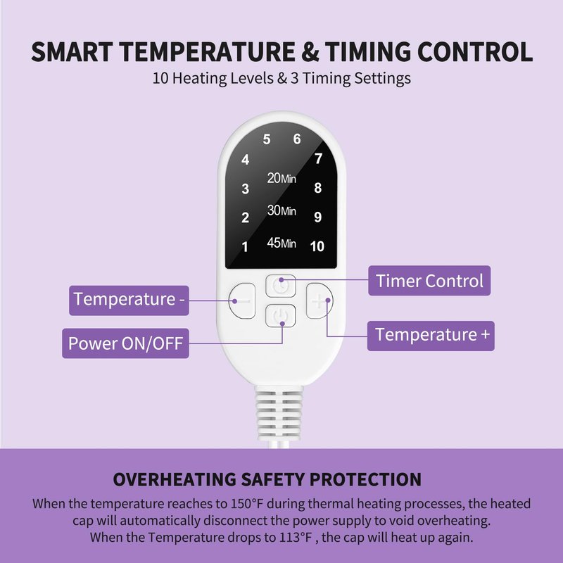 - High Temperature Automatic Shut-off Protection & Timer - Our deep conditioning heat cap has 10-level temperature control modes to choose from, let you adjust the temperature for your comfort with overheat protection. 20-45 minutes 3 timer mode for optimal use, When the temperature reaches 65 °C, the plug stops automatically and stops heating, the temperature drops to 45, it will heat again to continue working, which offer the maximum comfort and safety for you