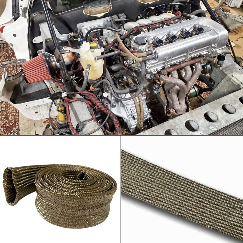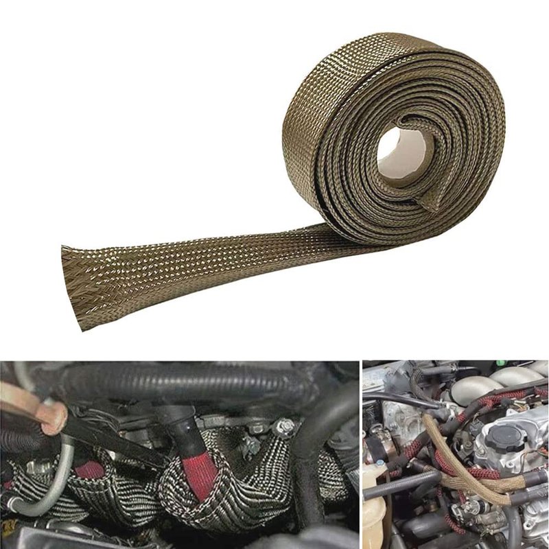 - ✅【Heat Shield Sleeve 】—— This titanium color automotive wire heat shield sleeve tape is made of high quality basalt material which can withstand higher temperature than those fiberglass hose heat shield. The wire heat shield wrap for car wire can help to prevent vapor lock, protect spark plug wires from melting,and protect sensitive wire looms from close proximity heat,shielding brake lines and hose and stopping clutch cables from melting.