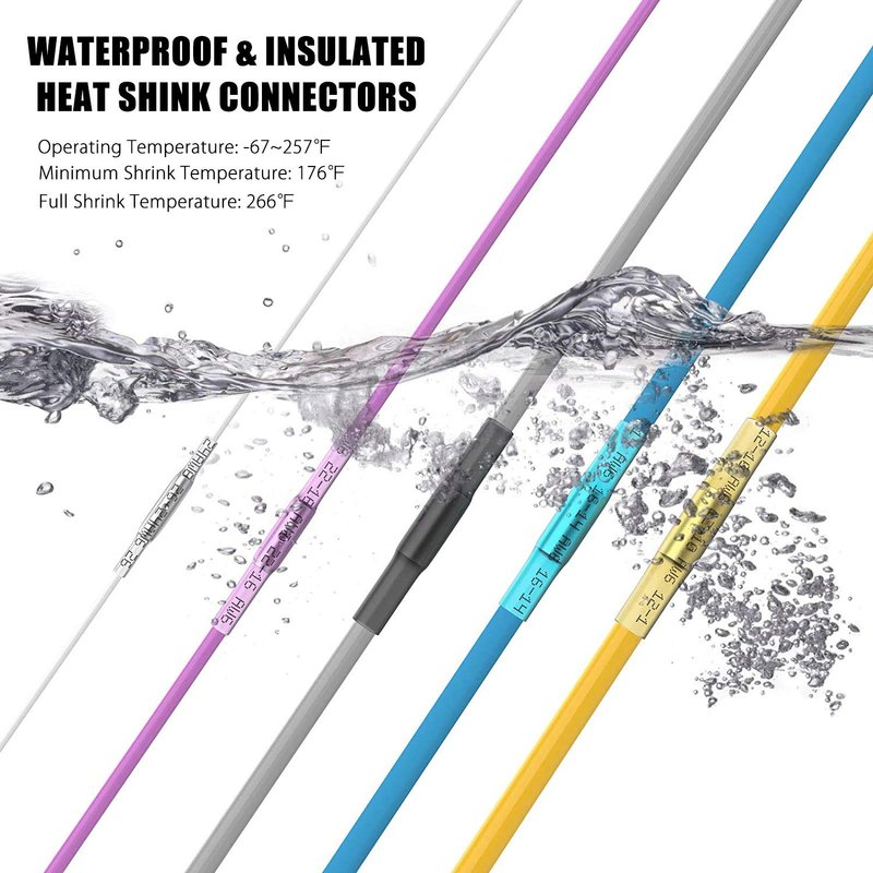 - 【MADE TO LAST】- Thanks to the thick tinned copper and seamless barrel desgin, it ensures strong and secure crimping all the time with no wire coming off issues. What's more, the polyolefin heat shrink tubing provides the high tensile strength and resistance to mechanical damage so there's no worry of rat chewing or similiar phisical damage issues. When heated with a heat gun, the adhesive melting inside create a waterproof and insulated seal, preventing electric leakage and corrosion