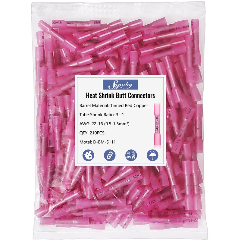 Heat Shrink Butt Wire Connectors, Sopoby 210Pcs 22-16 AWG Red Insulated Waterproof Electrical Wire Connectors Automotive Marine Grade Wire Crimp Terminals Butt Splices, Ideal for Boat, Truck, Red