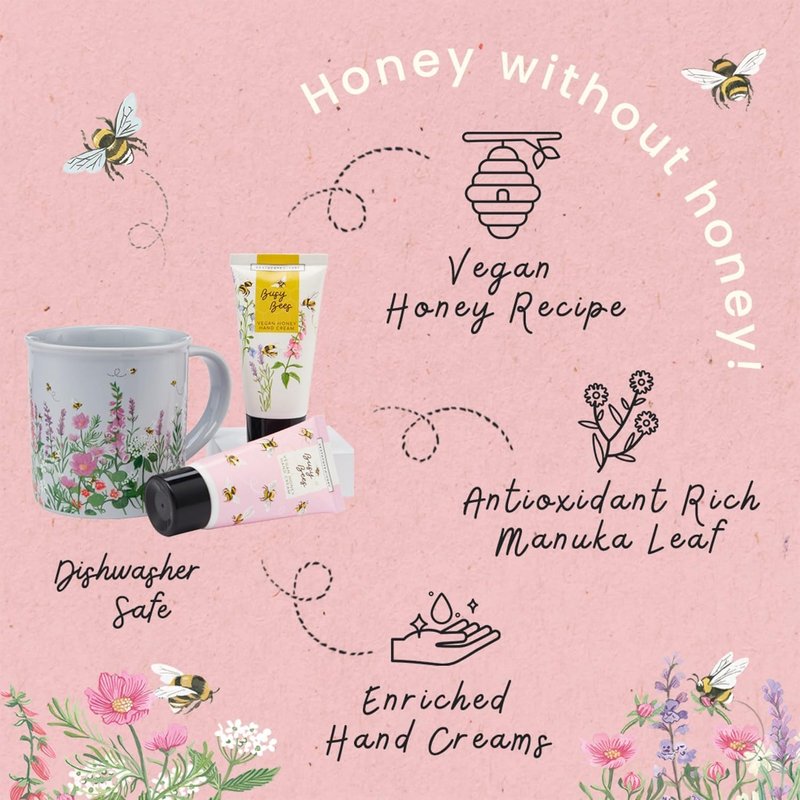 - A generously sized, artist-illustrated ceramic mug filled with two hand creams, perfect for bee loving vegans decorated with joyous flowers & bees.