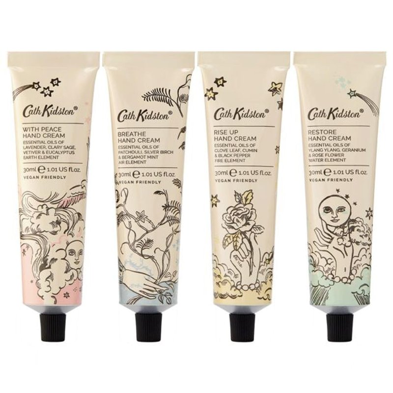 Nourish your hands with some luxury moisturiser using this set of hand cream from Cath Kidston in the Power to the Peaceful range. These tubes of hand cream, each holding 30ml of product, are the perfect size to slip into your bag, ready for your hands when on the go. Inspired by the four elements, the tubes are beautifully decorated with wonderful illustrations of moon faces and flora. Each tube of hand cream is enriched with essential oils to leave your hands feeling nourished, with each tube having a different blend to represents the four elements; With Peace - Earth element – A grounding blend of lavender, sage and patchouli. Breathe - Air element- Rich aroma of palo scent, sandalwood and frankincense. Rise Up - Fire element – A blend of amber, floral musk and spice. Restore - Water element – Notes of geranium, ylang ylang and rose.