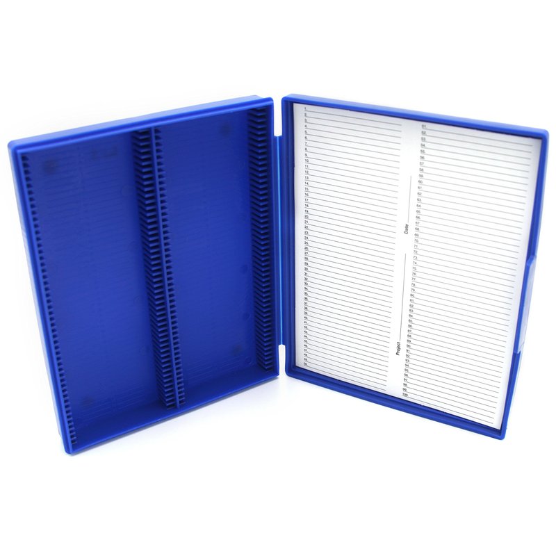 - Polypropylene storage box for holding either 25 or 100 microscope slides securely
