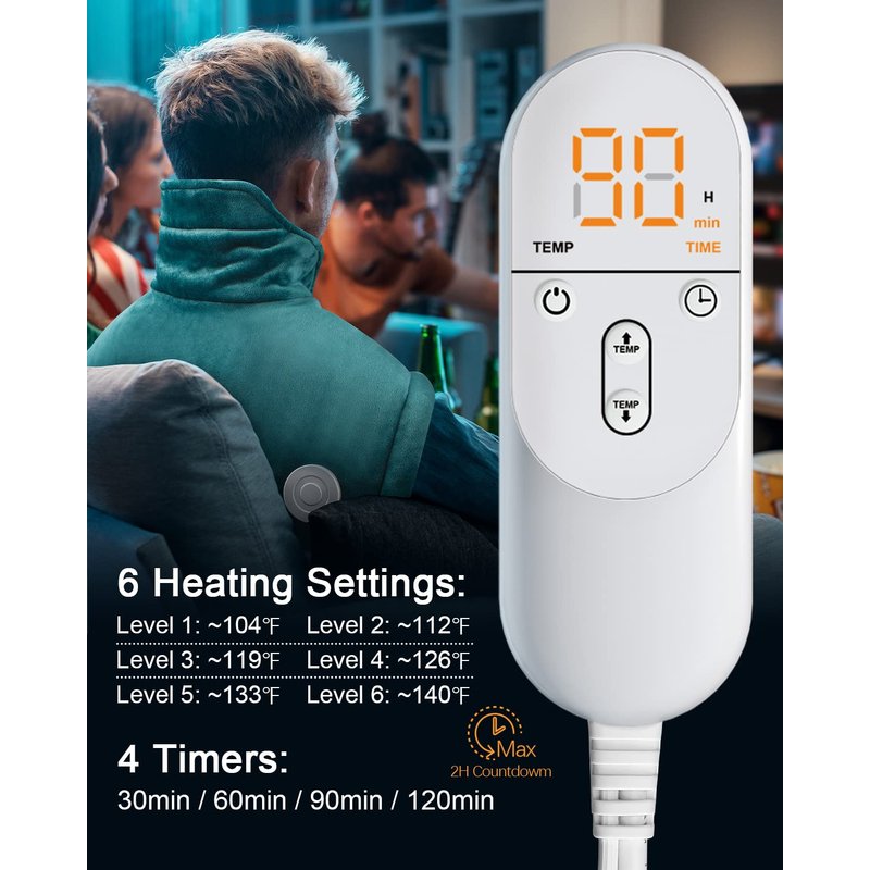 - Simple Control by Raised Key and Blacklight: The big digital backlit display controller of heating pads with raised setting keys, make it easier for aged grandma and grandpa to find the controller and discern settings. Four timer options of 30/60/90/120min, the Max 2 hours countdown auto shut off, regulating your heating time moderately while allowing fully enjoy the comfort bring by the shoulder heating pad. Perfect gifts for him or her