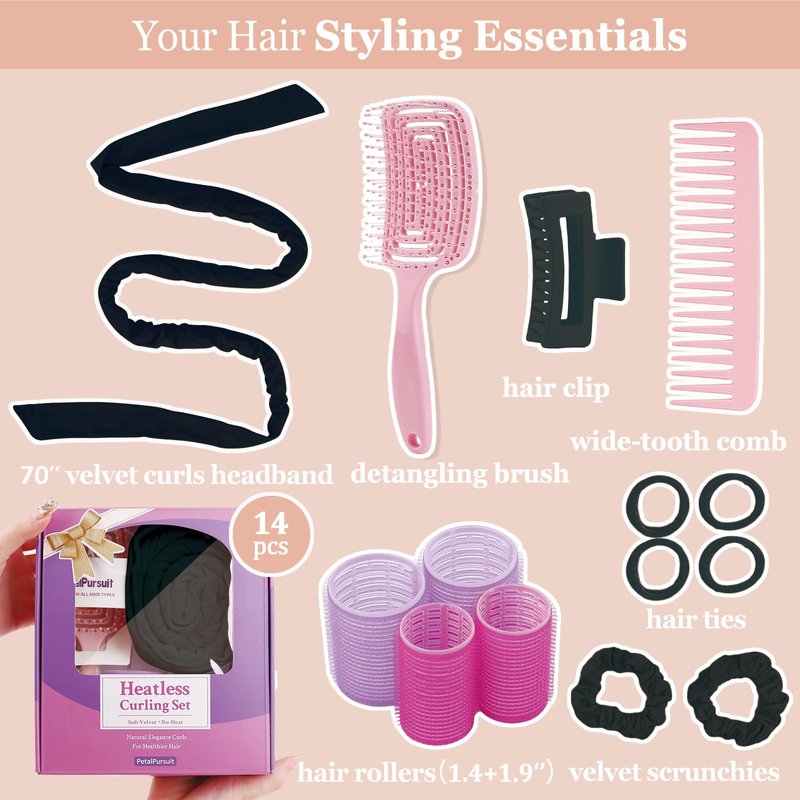 - Heatless Curling Set:70-inch velvet hair curler, 2 velour hair ties, 4 elastic hair ties, hair clips, wide-tooth comb, detangling brush, 4 hair rollers, and it's well-packed with an exquisite gift box. Perfect rollers hair curlers gift set for all women and girls.