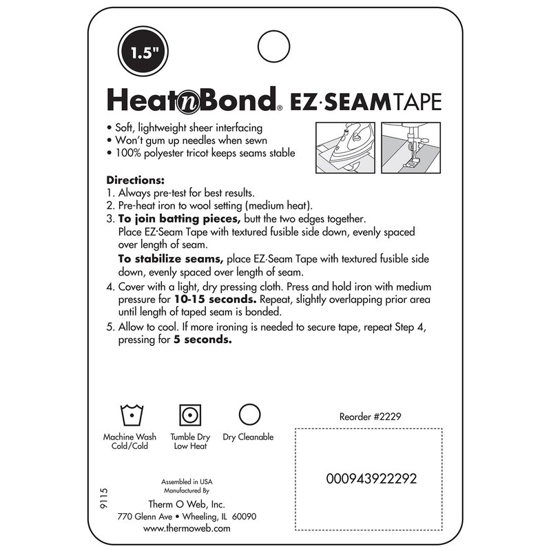 With HeatnBond EZ-Seam Fusible Batting Tape, there's no more throwing away perfectly-good scrap pieces of batting. HeatnBond EZ Seam Fusible Sheer Tape is fusible interfacing for seaming together leftover pieces of batting. Batting tape is smooth which means no mid-quilt lumpy areas, and less pinning and sewing.