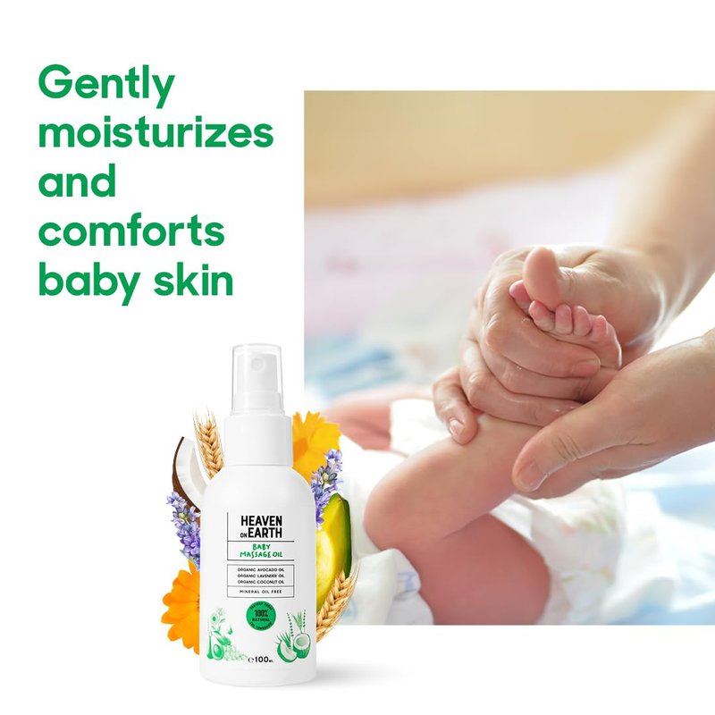 Heaven on Earth Baby Oil for Newborns, Prevent Moisture loss with Enriched with Natural Oils, Lavender Oil, Jojoba Oil, Coconut Oil, Olive Oil Extracts, Paraben, Sulfate, Parfum Free, 4 fl oz.