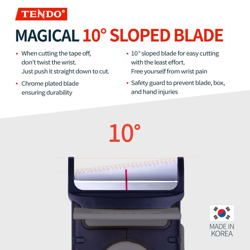 - CUT THE TAPE EASILY WITH 10° TILTED BLADE – Our patented blade is tilted by 10 degrees. So, you can cut the tape easily even with just a little bit of force. Chromium plating and 10 steps of abrasive processes of Tendo’s Blade provide strong durability and cutting power. Blade Replacement Function is also available.