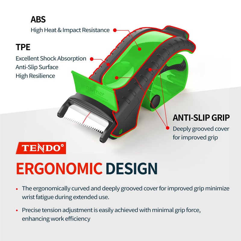 Heavy Duty Shipping Tape Dispenser: TENDO° Premium Line – Reusable, Replaceable, Eco-Friendly 2’’ Master Piece Dispenser for Pros with Patented 10° Sloped Chromium Blades - P-2200 (4th Gen.)_Green