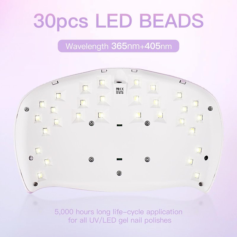 30pcs UV/LED lamp with specially ergonomic design based on your finger. The light of UV LED nail lamp comes from every direction to thoroughly dry UV gel nail polish. Being highly accurate and reliable, professional UV light for nails ensures every inch of your each nail will be dried evenly and effectively. no more extra light burned the skin of your hand. No more dizziness or uncomfortable eyes with its enhanced white light source.