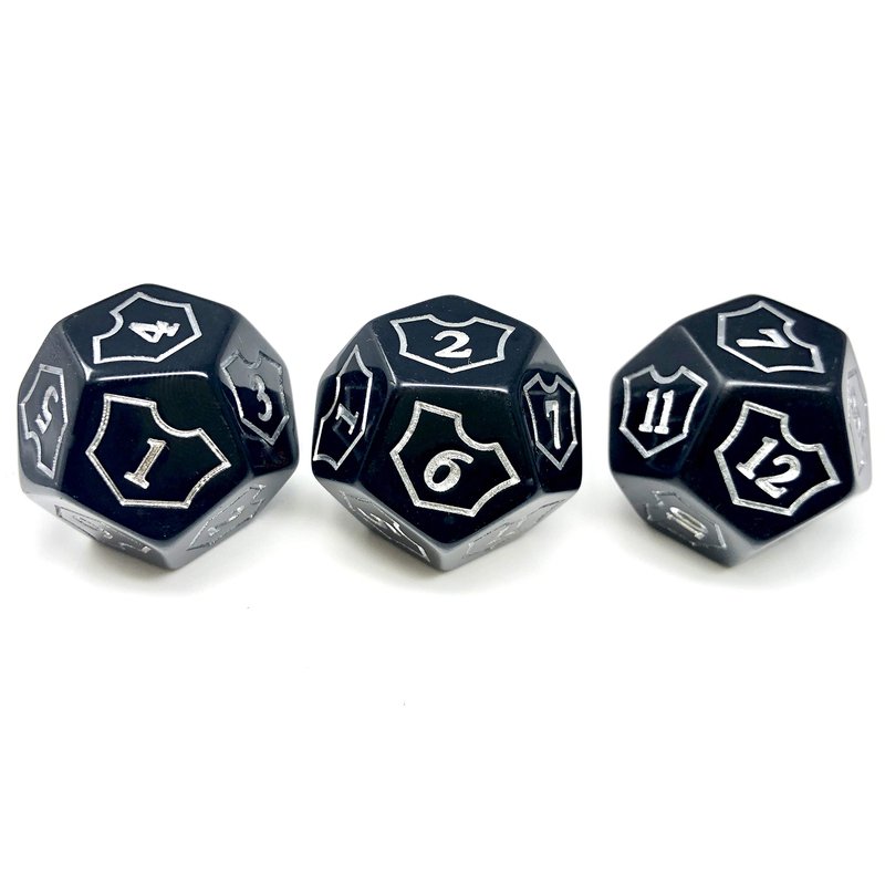 These 25mm D12 Loyalty Counter dice are perfect for keeping track of your Planeswalker's stats in Collectible Trading Card Games like Magic: The Gathering. This 3-Die Set includes 3 Black Loyalty Counter Dice. The Spin-Down arrangement of numbers let's you fluidly move from 1-12 with NO number-hunting when loyalty changes. Slightly (perfectly) oversized with a Glossy Finish and Bold Silver Ink makes these dice easily readable from either side of the table. A great way to keep both players aware of the game state and a fine edition to any deck box.