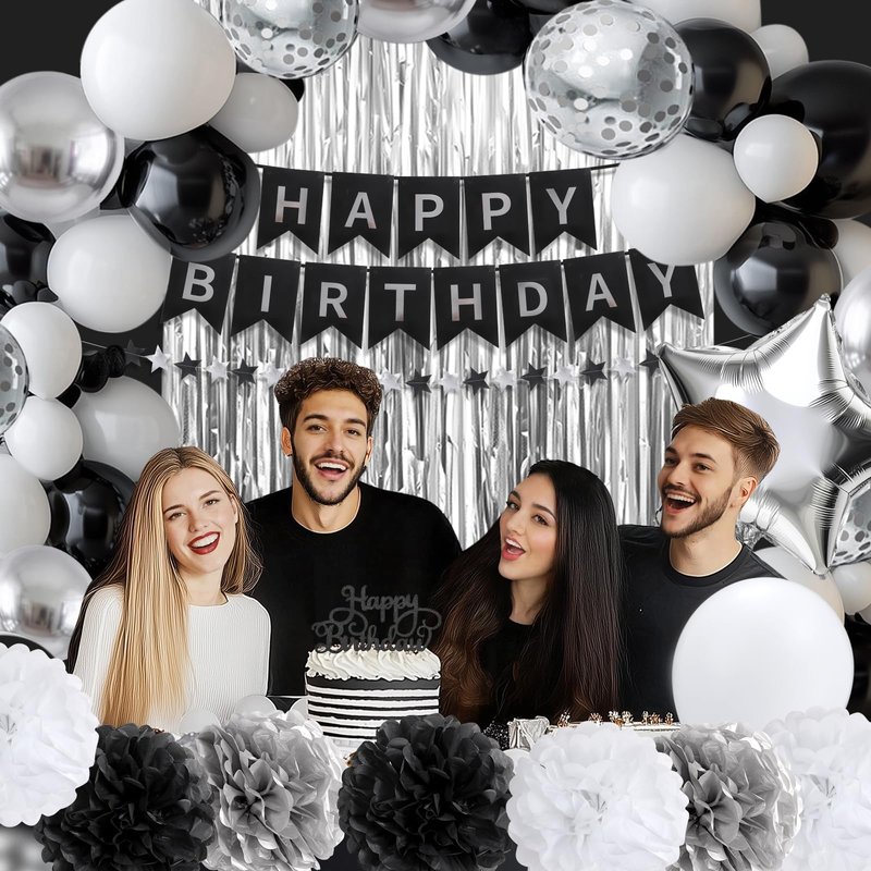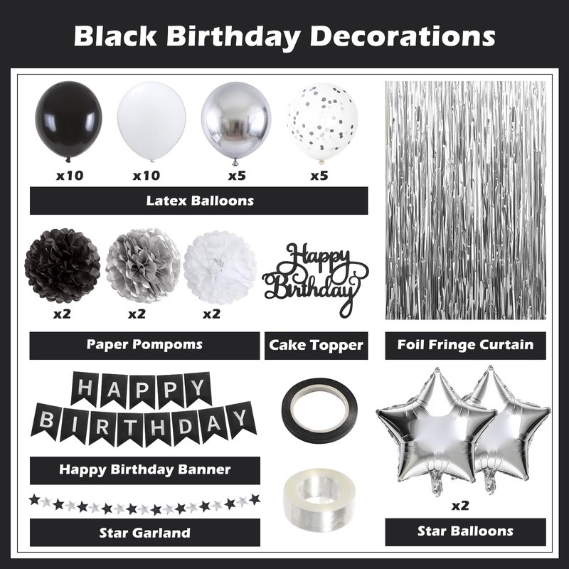 - Black and Silver Birthday Decorations: Our black party decorations kit includes everything you need to create a stunning party. It contains 30pcs latex balloons (black*10/white*10/metallic silver*5/confetti silver*5), 2pcs star balloons, 1pcs happy birthday banner, 1pcs foil fringe curtain, 6pcs tissue paper pompoms, 1pcs star garland, 1pcs cake topper, 1pcs ribbon, 1pcs balloon garland strip, and 1pcs large eye threading needle