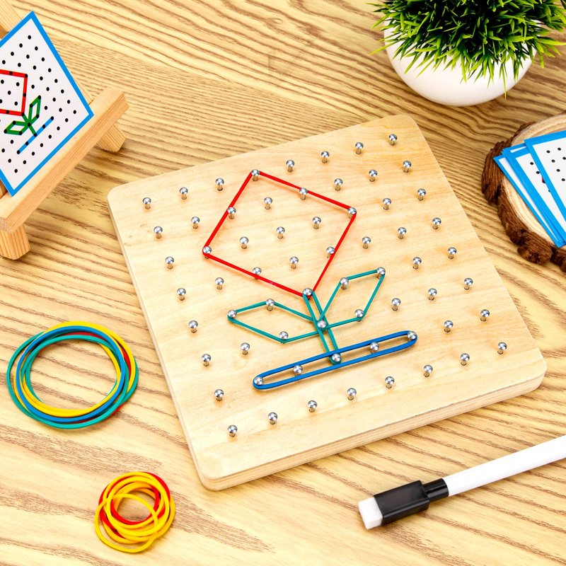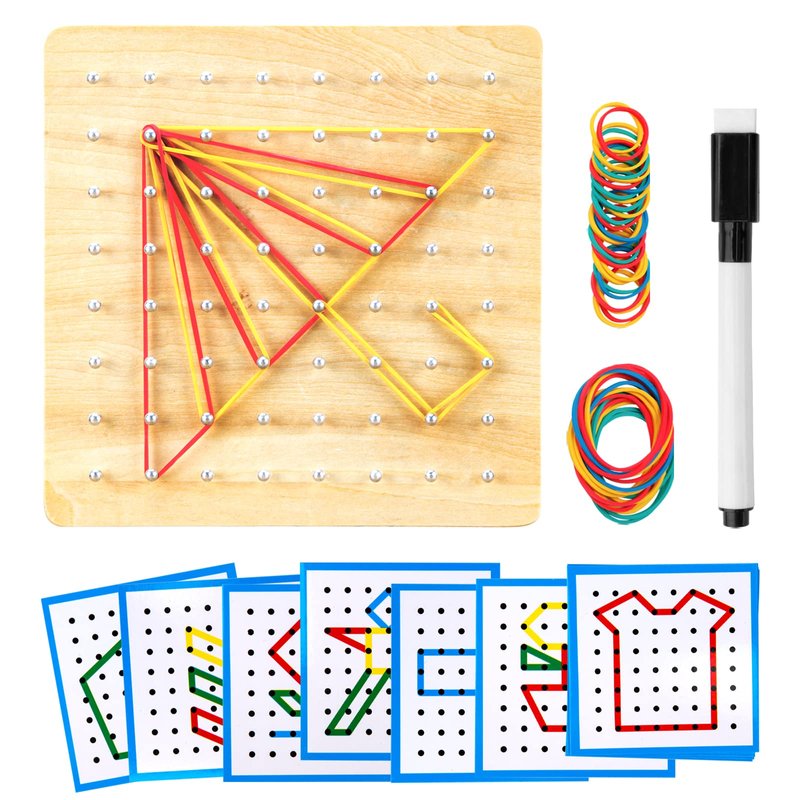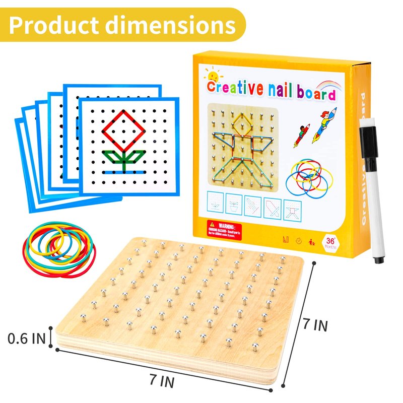 - Parent-children Interactive Toys: Be helpful for kids to develop fine motor skills and hand-eye coordination through manipulating the rubber bands into the nails.It’s great for learning math and literacy skills by identifying geometry shapes and letters along with forms. Learn about polygons for analytical kids and other shapes for imaginative and creative kids.