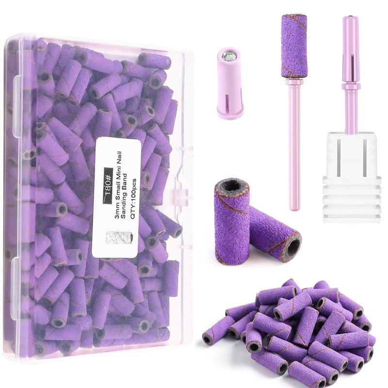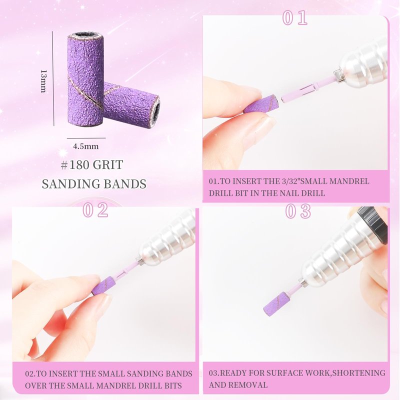 - 【Upgrade 3.1mm Nail Sanding Bands Set】Our Nail Sanding Bands Set Come With 100pcs #180 medium grits small sanding bands which work perfectly with the included 3.1mm small mandrel nail bit. Create a comfortable nail experience when removing gel nails, shaping acrylic nails, and blending for a smooth surface.