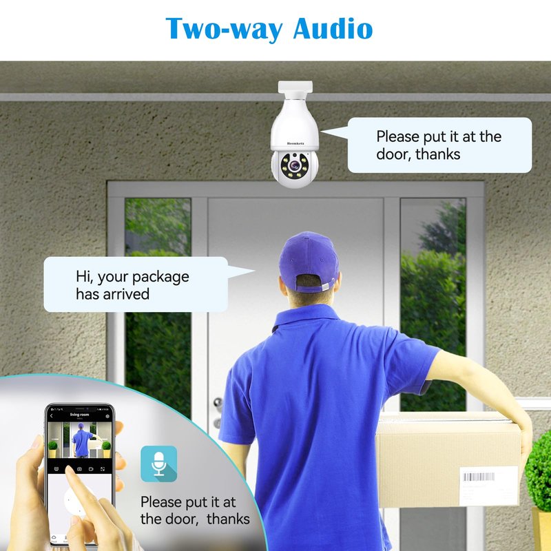 - 【Two-Way Talk & Instant Alerts】Speak to visitors or deter intruders via real-time two-way audio on this light bulb security camera. Get smart alerts on your phone + trigger white light/siren to scare off threats instantly.