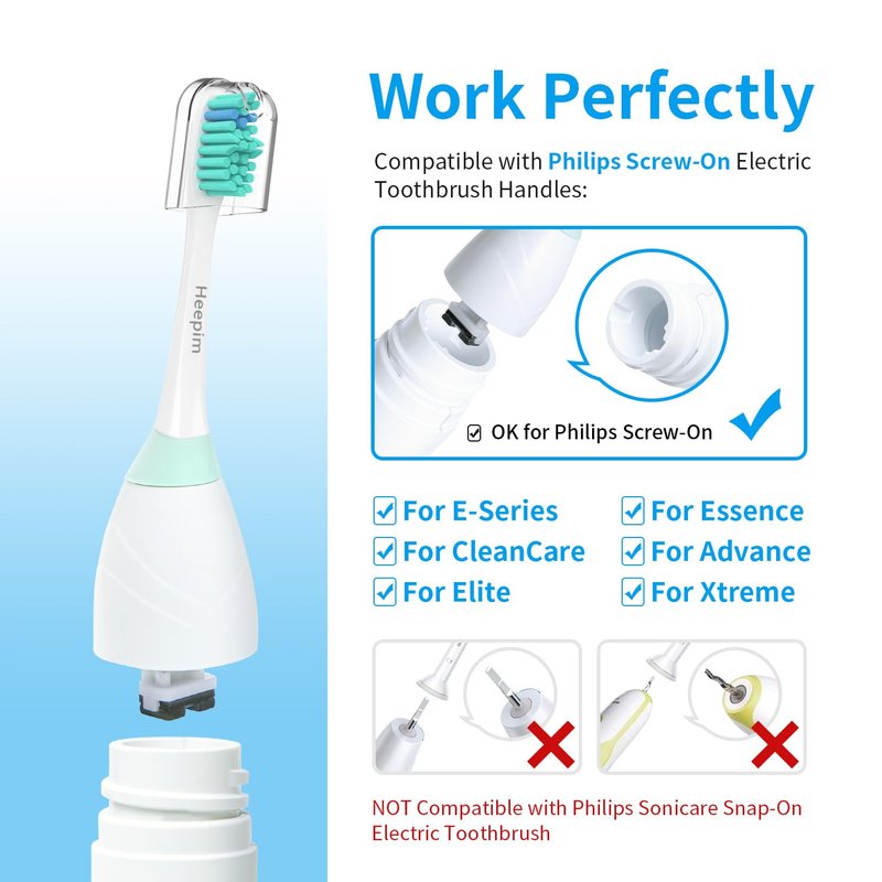 Heepim Replacement Toothbrush Headsa. Works as Good as the Original, for A Lot Less Money. b. Hepls Keep Teeth Clean and White. c. Healthy and Safety Standard. Gentle but Effective Cleaning The angled neck assures effective cleaning on the surface and at hard-to-reach areas. End-rounded bristles protect your teeth and gums from being hurt. Genuine US Dupont Bristles 100% same as name brand, planted skillfully to avoid falling off. Enjoy Your Brushing The replacement heads are much more durable thanks to the upgraded PP material. Always be on-time for Replacement Reminder bristles fade in color to let you know when it’s time to replace your toothbrush head. Dentist suggests the replacement every 3 months. These brush replacement heads are compatible with all SCREW-ON Philips Sonicare E-series toothbrush handles! The Following Handles are supported: -For Sonicare Essence | E-Series -For Sonicare Advance -For Sonicare Elite -For Sonicare CleanCare -For Sonicare Extreme These replacement brush heads are compatible with all of the following SCREW-ON handle models: HX3xxx: HX3300 HX3351 HX3500 HX3551 HX3881 HX4xxx: HX4002 HX4101 HX4011 HX4321 HX4472 HX4511 HX4572 HX4573 HX4772 HX4871 HX4872 HX5xxx: HX5130 HX5251 HX5300 HX5310 HX5350 HX5351 HX5352 HX5400 HX5451 HX5500 HX5551 HX5581 HX5610 HX5611 HX5751 HX5752 HX5754 HX5810 HX5853 HX5910 HX7xxx: HX7351 HX7361 HX7381 HX7551 HX7553 HX7800 HX7841 HX7881 HX9xxx: HX9500 HX9551 HX9552 HX9553 HX9562 HX9842 HX9882 Other: Advance e-4000/Essence e-5000/Elite e7000/e9000/Xtreme/e3000 Package: Six SCREW-ON toothbrush heads and six hygienic travel caps. Disclaimer: These toothbrush heads are manufactured independently by Heepim.