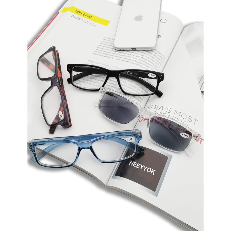 HEEYYOK 4 Pack Reading Glasses for Men 4.0+,Quality Readers with Spring Hinges Includes Sun Readers, Reduce Eyestrain/Glare Eyeglasses