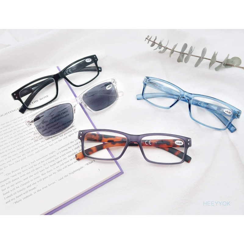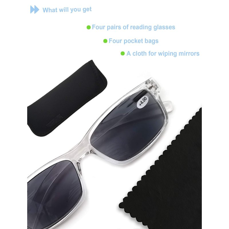 - 【Package Details】4 pack of reading glasses(include 1 sunglasses) + 4 pcs of readers' soft cases + 1 pc of microfiber cleaning cloth.