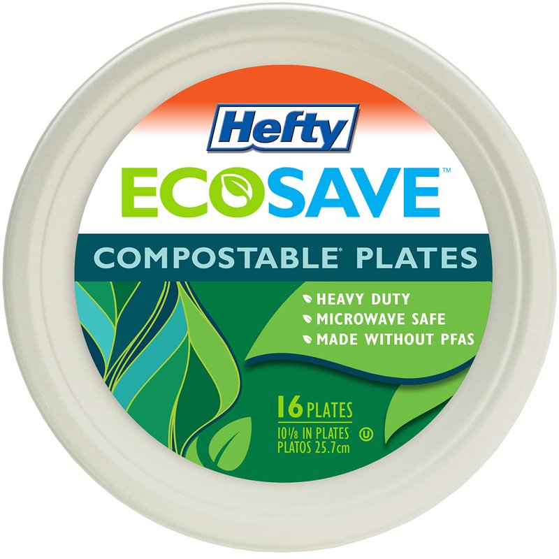 - DISPOSABLE DINNER PLATES—Contains sixteen 10-1/8 inch molded fiber Hefty ECOSAVE disposable plates for easy cleanup