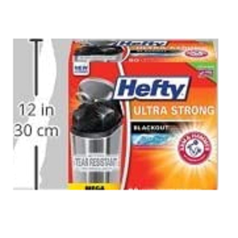Trust Hefty Ultra Strong Blackout Tall Kitchen Bags to keep your kitchen waste contained and out of sight. Thanks to Triple Action Technology, these tough trash can liners resist leaks and tears, providing the highest puncture protection available in a flexible garbage bag. That stretchy strength means you don't have to worry about unexpected bag breakage and inconvenient messes. The blackout kitchen trash bags hide unsightly messes, keeping your garbage in the dark. A break-resistant grip drawstring makes it easy to close the trash bag and cart it away without incident. As an added bonus, these tall kitchen garbage bags include a patented Arm & Hammer odor neutralizer to keep unpleasant smells at bay. A Clean Burst scent adds freshness. While these black garbage bags are just the right size for your kitchen trash can, don't be afraid to use them for tougher jobs, such as garage, basement and construction cleanups. These scented trash bags provide the strength and odor control you need to handle the heaviest and most odoriferous jobs. Every package of Hefty trash bags includes one clippable Box Tops for Education label to help you earn cash for your school. All Hefty trash bags are backed by a 100% satisfaction guarantee.
