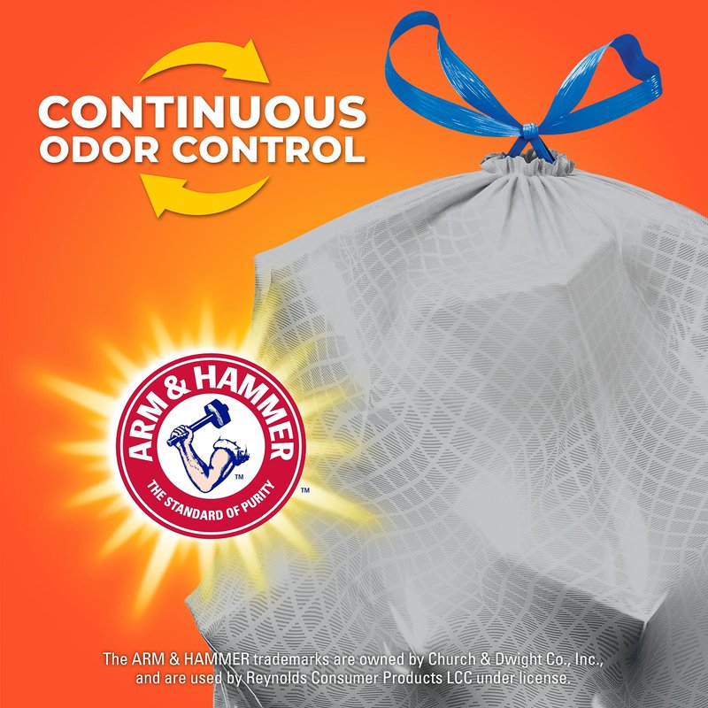 - 6 IN 1 PROTECTION—These flexible trash bags offer a powerful combination of six features that keep garbage where it belongs: flex strength, tough drawstring, patented odor control, resistance to leaks, puncture protection, and rip defense
