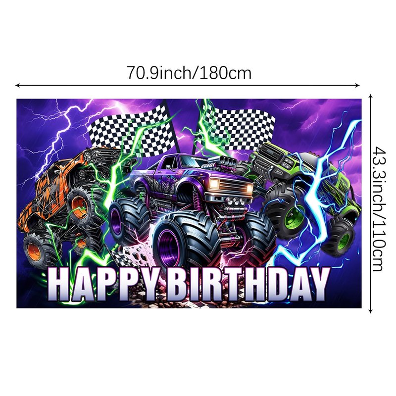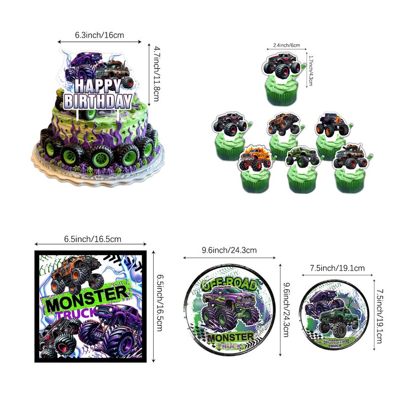 - 🎉【Products include :】 1 Monster truck background,60 Monster truck balloons, 1 Monster truck tablecloth, 10 9-inch plates, 10 7-inch plates, 20 napkin,10 forks and spoons each, 1 Happy Birthday cake toppers, 12 Monster truck cupcake toppers., 2 tire balloons,1 balloon chain,1 dot glue,1 knotter