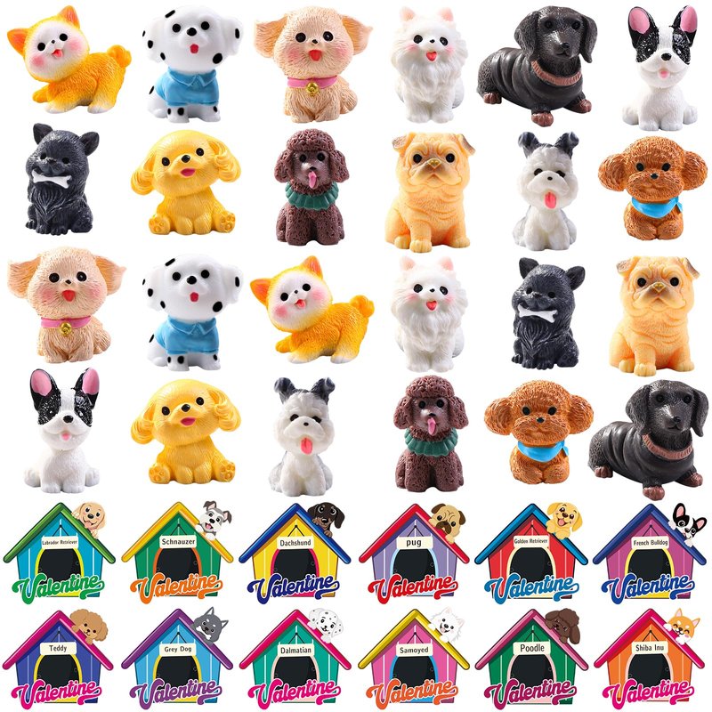 Heirloom Haven 24 Packs Valentines Day Gift Cards with Toys, Miniature Resin Puppy Dog Animals Figurines Valentines doghouse Cards for School Class Valentines Gifts Box for Kids Party Favors Exchange