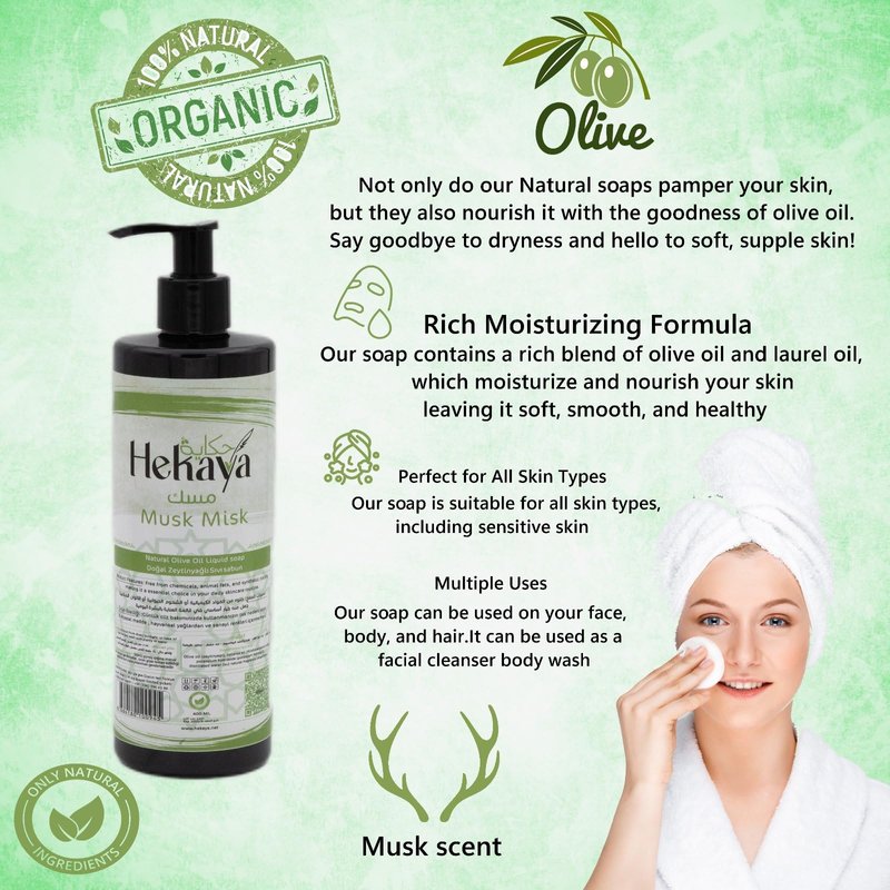 Experience the difference with Hekaya's Natural Liquid Soap! This gentle, sulfate-free, and paraben-free formula, crafted with nourishing olive oil and cleansing coconut oil, effectively removes dirt and impurities while leaving your skin feeling soft, smooth, and hydrated. Suitable for daily use on both face and body, this versatile soap pampers without irritation. The olive oil helps retain moisture, leaving your skin with a healthy glow. Enjoy a refreshing fragrance and a rich lather created with coconut and castor oils for a deep clean and invigorating experience. The convenient pump dispenser allows for easy, mess-free application. Perfect for those seeking a gentle yet effective cleansing experience, Hekaya Liquid Soap is a touch of nature's goodness for your daily routine. It's also sulfate-free and paraben-free, making it ideal for sensitive skin. Indulge in the purity of nature with our Handmade Soap Liquid. Crafted with care, this soap features a luxurious blend of Olive Oil, providing gentle cleansing and nourishment for your skin . Whether you're pampering yourself in the bath or refreshing your face , our all-natural formula is gentle yet effective. Free from synthetic additives and harsh chemicals, you can trust our soap to leave you feeling clean, refreshed, and naturally beautiful. Experience the goodness of nature with every pump of Handmade Soap Liquid. Indulge in a luxurious cleansing experience with our Natural Olive Oil Liquid Soap with Essential Oils. Crafted with care and enriched with the exotic scent of Musk, these soap offer a delightful aromatic journey for both women and men. Handmade using premium-quality natural olive oil and essential oils, our soap are designed to provide a gentle yet effective cleansing experience. Formulated with organic ingredients, they are gentle on the skin while effectively cleansing and moisturizing, leaving your skin feeling soft, smooth, and rejuvenated. Infused with moisturizing agents, these Liquid soap help keep your skin hydrated, making them perfect for daily use. Bottle size 13.5 ounces, ensuring long-lasting freshness and value. Transform your daily cleansing routine into a luxurious self-care experience with our Natural Olive Oil Liquid Soap with Essential Oils.