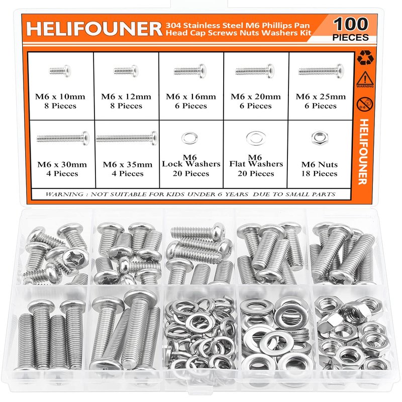 HELIFOUNER 100 Pieces M6 x 10mm /12mm /16mm /20mm /25mm /30mm /35mm, Phillips Pan Head Machine Screws, Metric Screws Bolts Washers Nuts Kit, 304 Stainless Steel