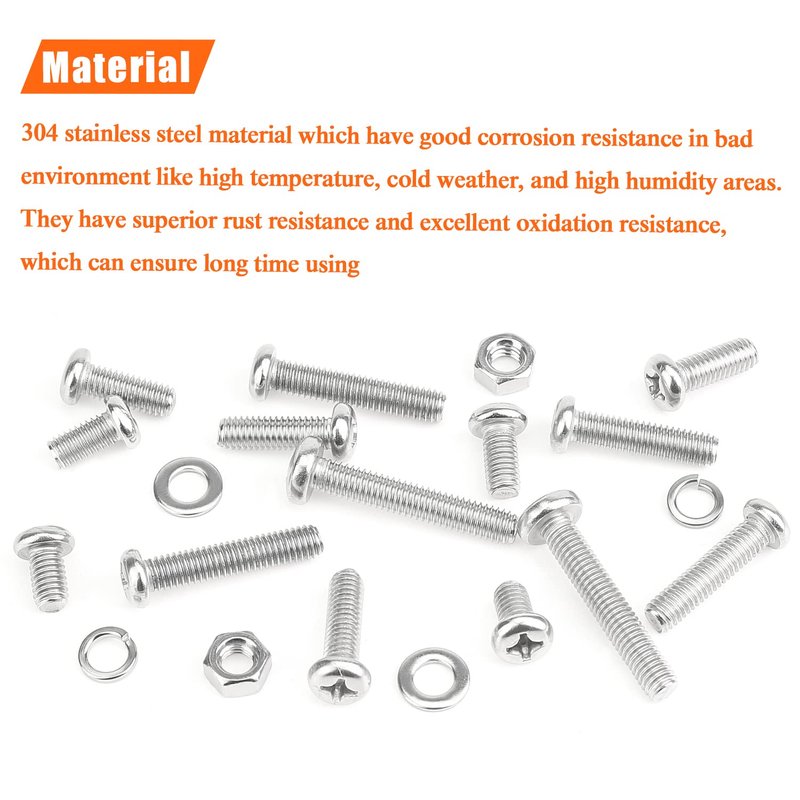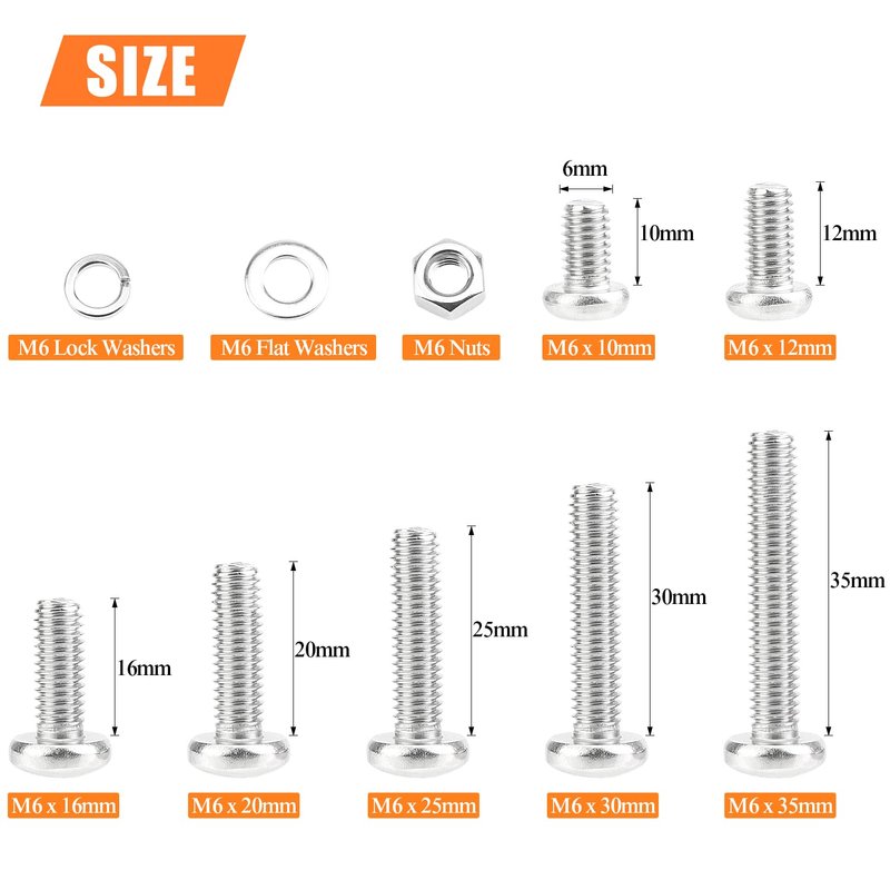 - 【Sizes】M6 x 10mm /12mm /16mm /20mm /25mm /30mm /35mm phillips pan head machine screws with matching hex nuts, lock washers and flat washers, total 7 sizes, different sizes can meet your different needs.