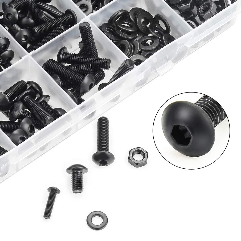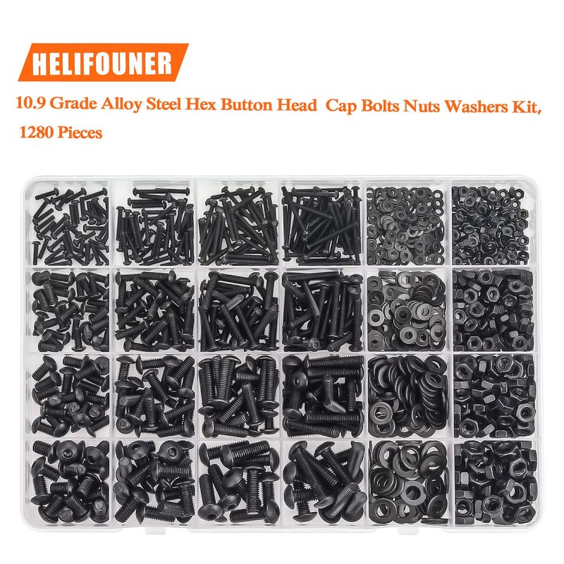 HELIFOUNER 1280 Pieces Button Head Socket Cap Screw Bolts, Flat Washers and Nuts Assortment Kit, 10.9 Grade Alloy Steel, Full Thread (M2 M3 M4 M5)