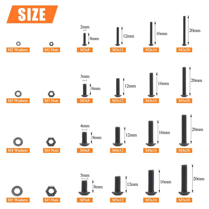 - 【Sizes】M2/M3/M4/M5 (8/12/16/20 mm) screw bolts nuts flat washers, different sizes can meet your different needs.