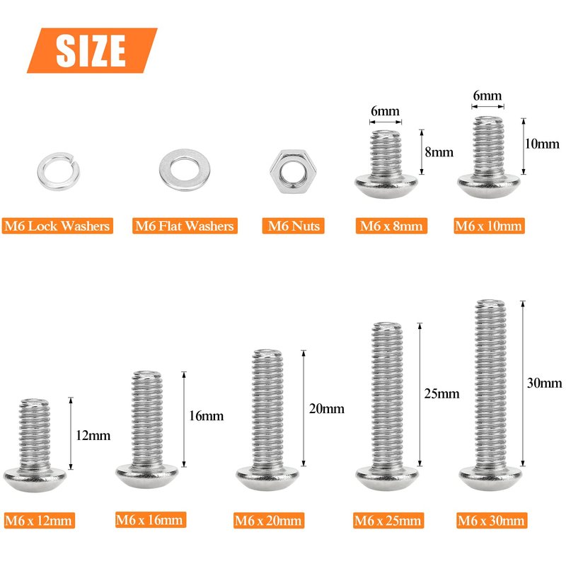 - 【Sizes】M6 x 8mm /10mm /12mm /16mm /20mm /25mm /30mm button head socket cap screws with matching hex nuts, lock washers and flat washers, total 7 sizes, different sizes can meet your different needs.