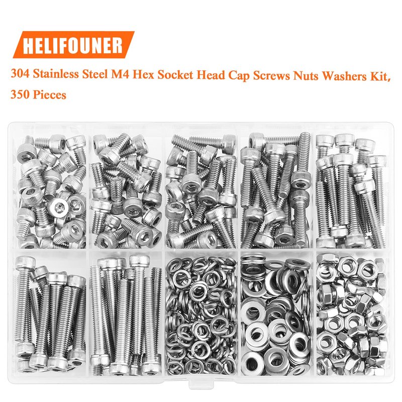 HELIFOUNER 350 Pieces M4 x 6mm /8mm /12mm /16mm /20mm /25mm /30mm, Hex Socket Head Cap Screws Bolts Washers Nuts Kit, 304 Stainless Steel